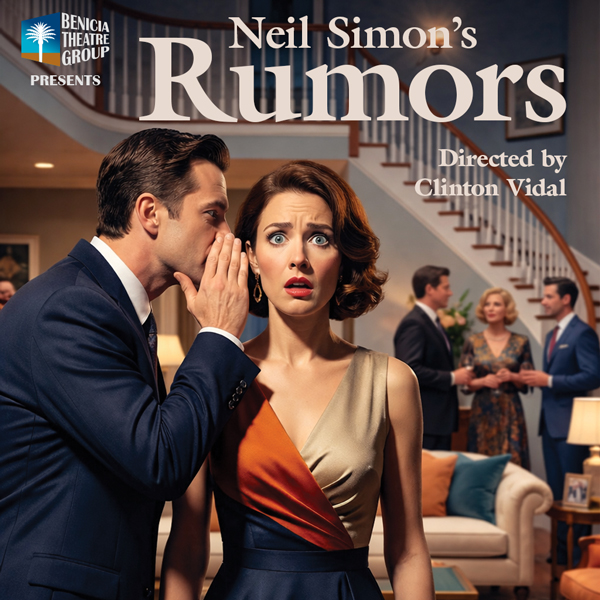 Historic BDES Hall 140 West J Street, Benicia, CA, United StatesRumors by Neil Simon Directed by Clinton Vidal Four couples arrive at a lavish anniversary party only to discover their host has been mysteriously injured and his wife is nowhere to be found. What follows is a domino effect of misunderstandings, secrets, and outrageous lies in one of Neil Simon’s most beloved comedies.